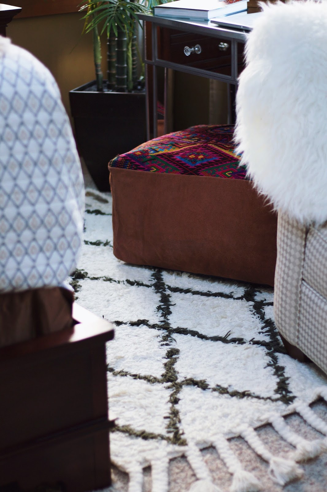 We already have carpet in the bedroom but it didn't do it for me. Nothing ruins a happy morning than dull floor! I added this fun Berber Moroccan Diamond rug. THE BEST PLACE TO GET RUGS..... *drum roll* ... RUGSUSA.COM ---> 75% OFF Regular retail! AMAZING! I got it in 5x8 but for most bedrooms a 4x6 foot rug is ideal.